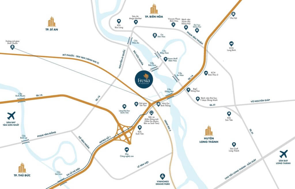 Dự án Fresia Riverside là một khu căn hộ cao cấp có mức giá bình dân phục vụ nhu cầu ở thực, tọa lạc tại mặt tiền đường Bùi Hữu Nghĩa, phường Tân Vạn, thành phố Biên Hòa, tỉnh Đồng Nai. Dự án nằm gần kề Xa lộ Hà Nội (Quốc lộ 1A), thuận tiện kết nối với các khu vực lân cận và trung tâm thành phố. Với vị trí đắc địa và thiết kế hiện đại, Fresia Riverside hứa hẹn mang đến cho cư dân một không gian sống lý tưởng và cơ hội đầu tư hấp dẫn.