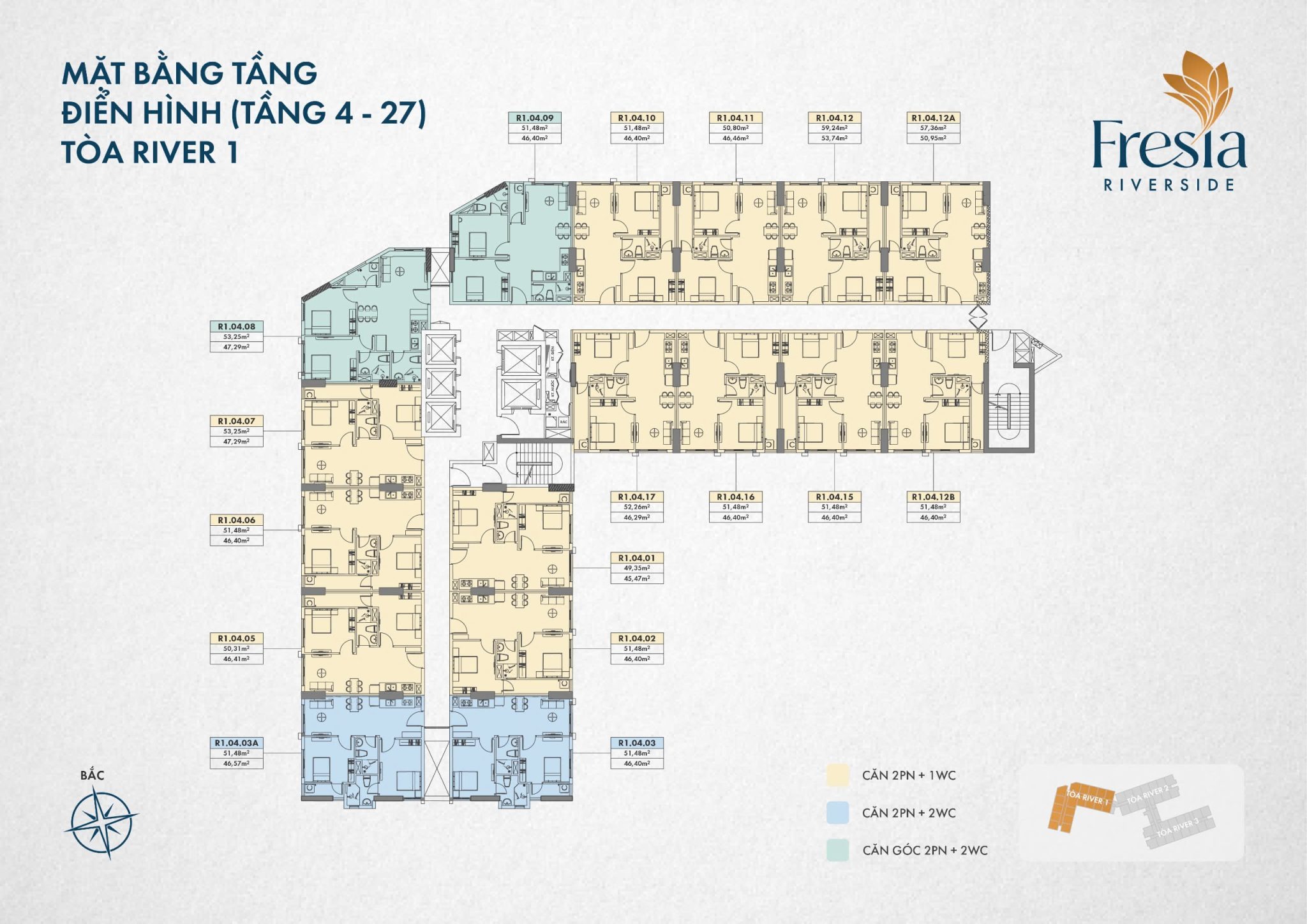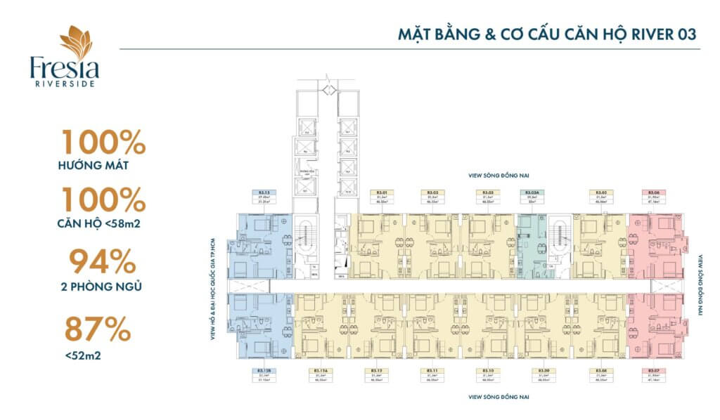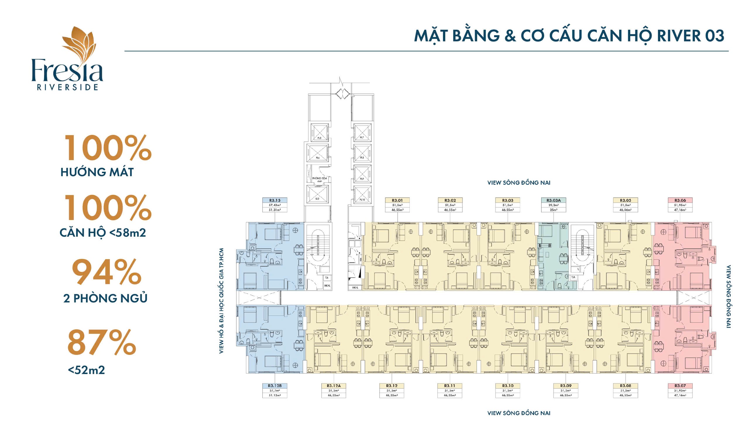 Với tổng diện tích hơn 7.800m², quy mô 30 tầng nổi và 3 tầng hầm, Fresia Riverside cung cấp ra thị trường 1.153 căn hộ hiện đại, trong đó bao gồm các căn hộ tiêu chuẩn và dòng sản phẩm duplex cao cấp. Với mật độ xây dựng chỉ khoảng 32%, phần lớn diện tích dự án được dành cho không gian xanh, lối đi bộ, sân chơi và hồ bơi, mang đến một môi trường sống lý tưởng.