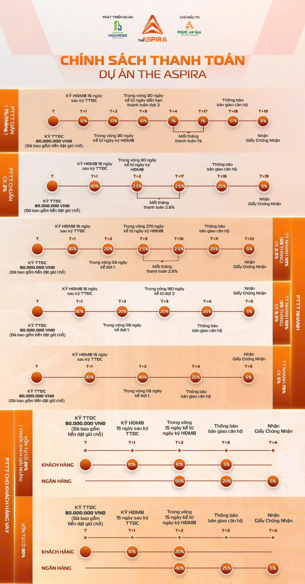 Phương thức thanh toán dự án căn hộ The Aspira sẽ thanh toán nhiều đợt linh hoạt theo tiến độ xây dựng và sẽ được Ngân hàng hỗ trợ cho vay. Hợp đồng thanh toán được chia thành nhiều đợt với chính sách ưu đãi và hỗ trợ từ ngân hàng giúp người mua chủ động dòng tiền đồng thời theo dõi được tiến độ xây dựng của dự án. Quý anh/chị cần hỗ trợ thêm thông tin về thanh toán và ưu đãi của dự án The Aspira Dĩ An vui lòng liên hệ qua zalo, viber và hotline 0909589036 để được tư vấn nhiệt tình nhất.