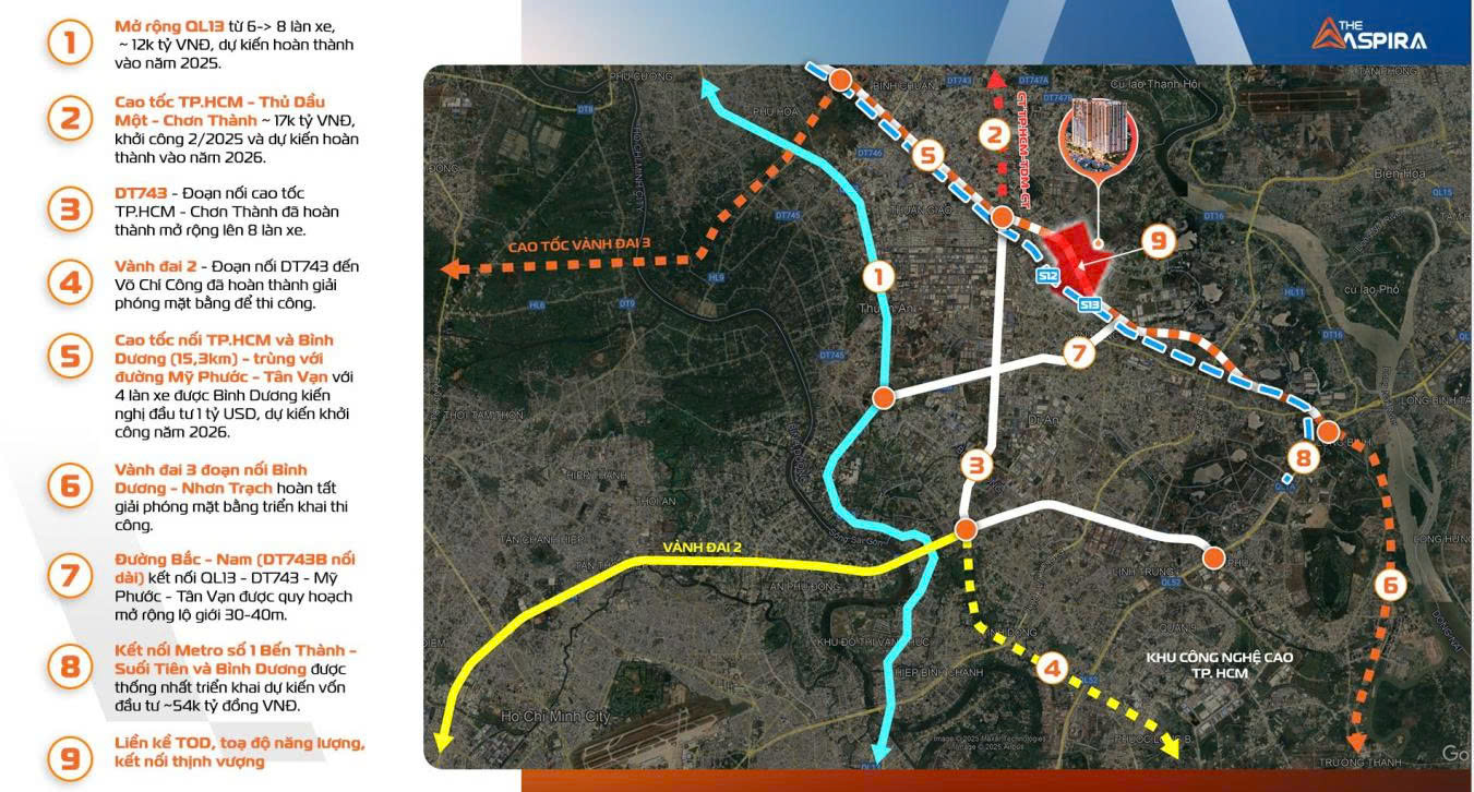 Quý khách hàng ở tại dự án này dễ di chuyển vì dự án nằm ngay mặt tiền Quốc lộ 1K hay còn gọi là trục Phạm Văn Đồng Nối dài, từ chung cư The Aspira dễ dàng kết nối các trục đường trọng yếu như: