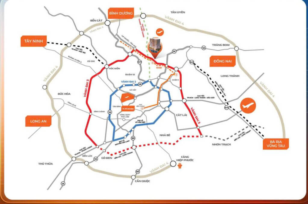 - Phía Bắc: Kết nối trực tiếp về trung tâm TP.HCM qua Quốc lộ 13 và cầu Vĩnh Bình