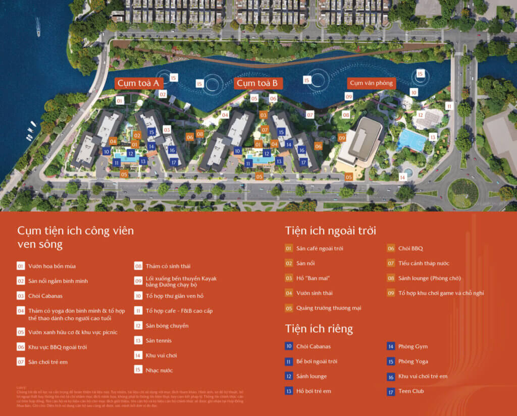 Tiện ích nội khuCông viên ven sông, kênh đào dài 2km, công viên cây xanh 13 hecta, hồ bơi, trường học quốc tế, bệnh viện quốc tế, trung tâm thương mại 123.000m2, nhà hàng, cafe, khu mua sắm, Spa,…